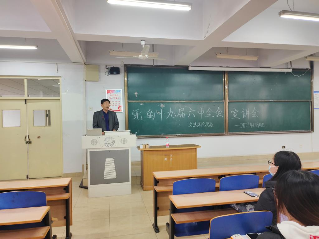 11月18日下午,太阳成集团tyc234cc组织召开党的十九届六中全会精神宣讲会,党委书记郝东主持宣讲活动,全体党员通过线上、线下两种方式参加了学习活动。