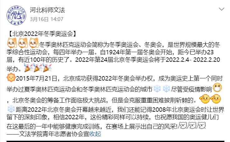 近年来,我国对冰雪运动的关注人数逐渐上升。距离2022年北京冬奥会的开幕越来越近,但是受疫情影响,北京冬奥会的筹备工作面临着极大挑战。活动开始前,负责人向志愿者传达开展本次宣传活动的相关要求,志愿者想要通过制作海报、剪辑视频等方式来进行宣传。在活动期间,志愿者将自己的作品发表在微博、QQ空间等热门平台上进行宣传,介绍冬奥会的起源、举办时间以及中国冰雪运动的历史,负责人动员全校师生进行点赞、转发,营造出了喜迎冬奥的良好社会氛围。
