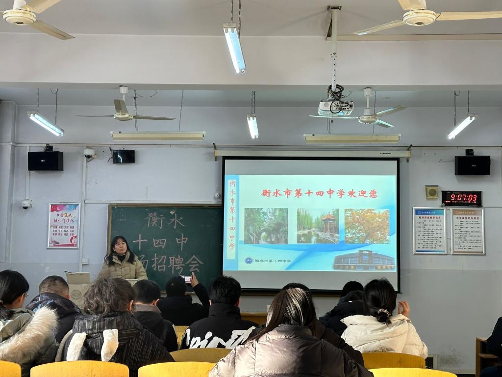 会议伊始,衡水十四中王董事长详细介绍了公司概况、教育理念、上班时间、值班时间、入职培训和薪资待遇等同学们迫切关注的问题。衡水市第十四中学是衡水市桃城区唯一一所国办重点高中。公司“以生为本”“以师为根”,给教师一方发挥自我的空间,引导员工修身正己,激励广大教师自我超越。同时,新教师不实行坐班制、公司所有课堂均允许新教师听课学习等办学制度也为教师发展提供了广阔空间。会议最后,同学们依次完成了精彩的试讲,多名同学与衡水十四中有签约意向,并与随行老师深入沟通,王董事长也对公司员工的专业素养提出极大赞赏。