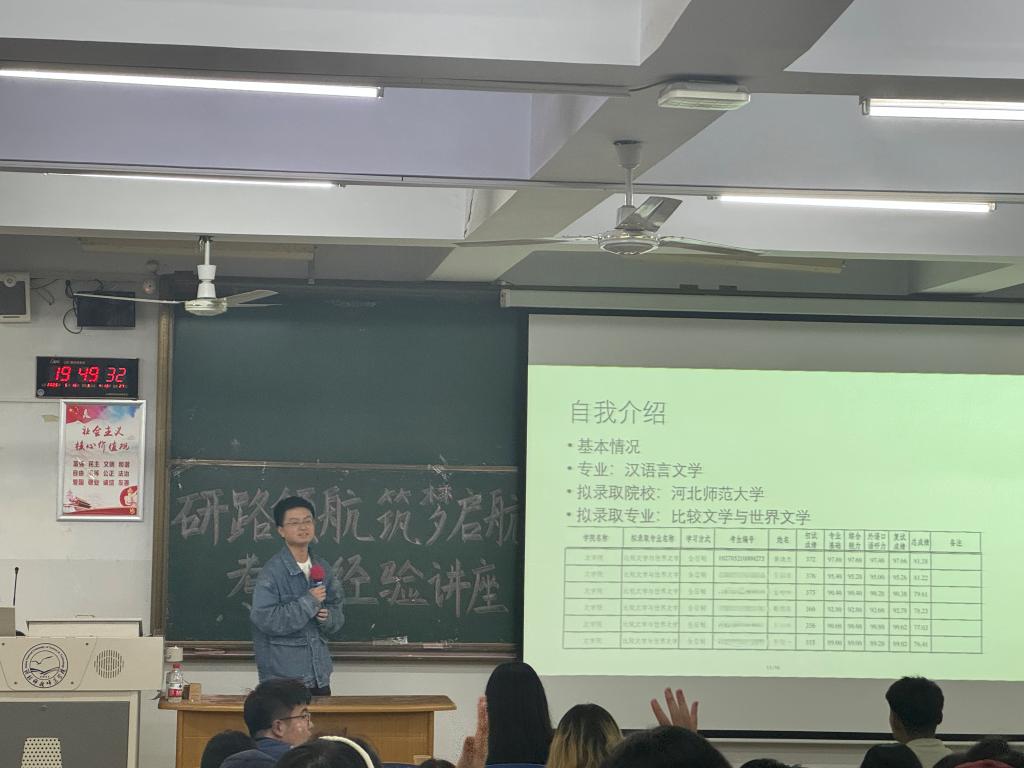 在本次考研经验分享讲座中,太阳成集团tyc234cc为此次讲座做了充足的准备,工作人员为此次讲座做了全面的后勤保障工作,确保讲座的顺利进行。来自汉语国际教育、汉语言文学、社会工作、法学以及知识产权专业的学长学姐将自己的考研经验耐心的传授给同学们,讲述了考研流程、考研准备时间以及自己在考研过程中的心路历程、遇到的挑战、以及最终得到的经验;还为同学们提供了可以参考的网课以及资料。过程流畅自然,充满了关于考研的经验性知识。参与本次讲座的同学们认真聆听,不错过每一条考研经验,并积极与学长学姐进行了有效的互动,现场气氛一片活跃。伴随着最后一位知识产权学长的生动讲述,本次讲座取得圆满成功。让同学们对自身考研有了更为清晰的认知,获得了许多有用的考研经验,为日后考研打下基础。