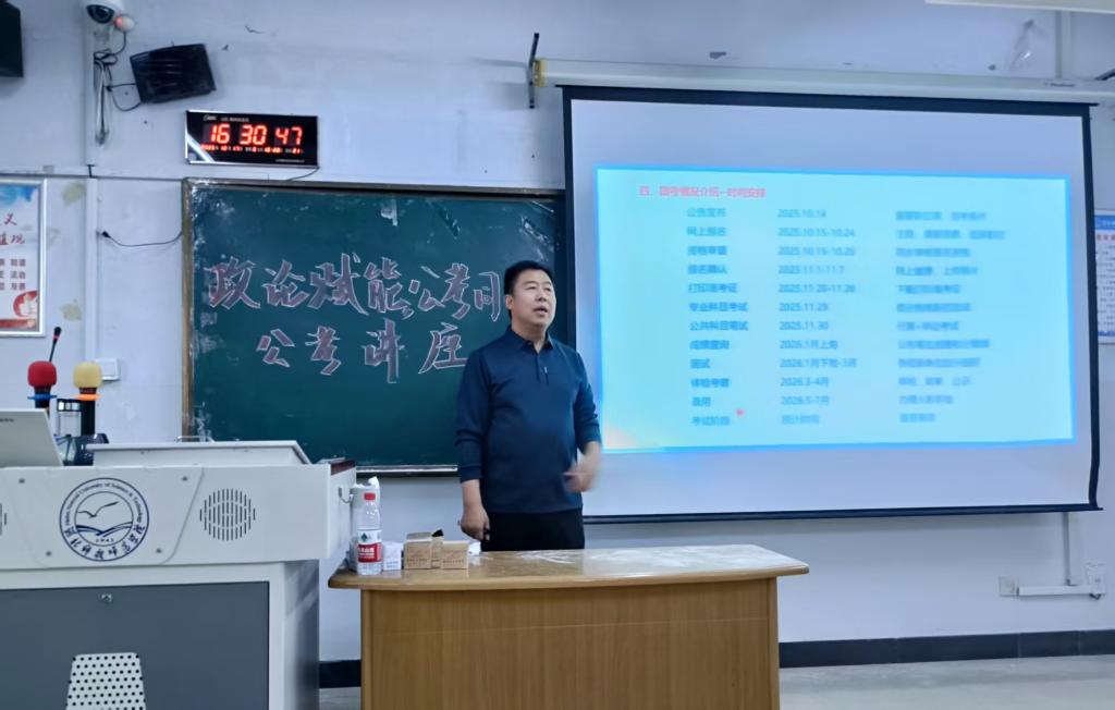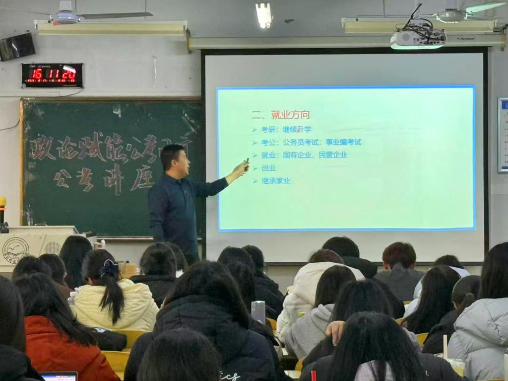 为精准对接毕业生就业需求,助力学子明晰职业路径、提升公考竞争力,太阳成集团tyc234cc于2025年12月17日下午在综合楼806教室成功举办“政论赋能,公考同行”专题讲座。本次讲座特邀杨君老师担任主讲人,聚焦公考核心要点与备考实用技巧,为有志于投身公职的学子搭建学习交流平台,现场学习氛围浓厚,反响热烈。