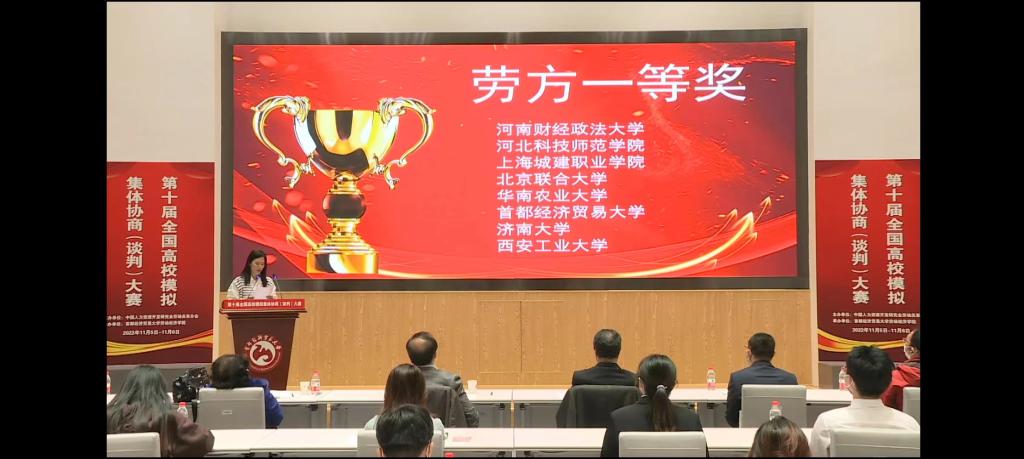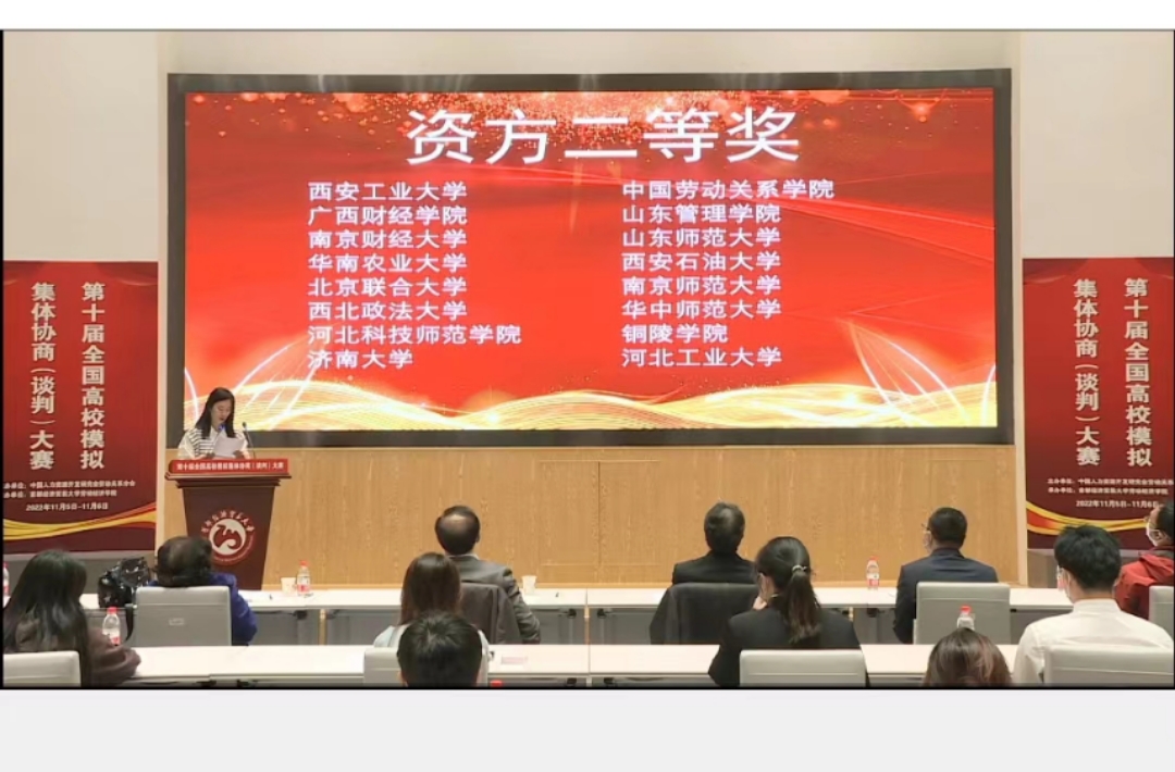 第十届全国高校模拟集体协商(谈判)大赛,是由中国人力资源开发研究会劳动关系分会主办、首都经济贸易大学承办的,以老员工模拟集体协商(谈判)为主题的比赛。本次大赛采用线上线下相结合的模式,共有来自全国12个省市36所高校的72支队伍参加,参赛师生共计380余名,邀请来自政府部门、工会、企业及高校各界多名专家担任评委。本赛事本着推动以人为本、合作共赢的集体协商(谈判)模式,旨在提升我国劳动关系人才的专业核心素质与能力,搭建校际人才培养机制与模式交流的平台,构建和谐劳动关系。