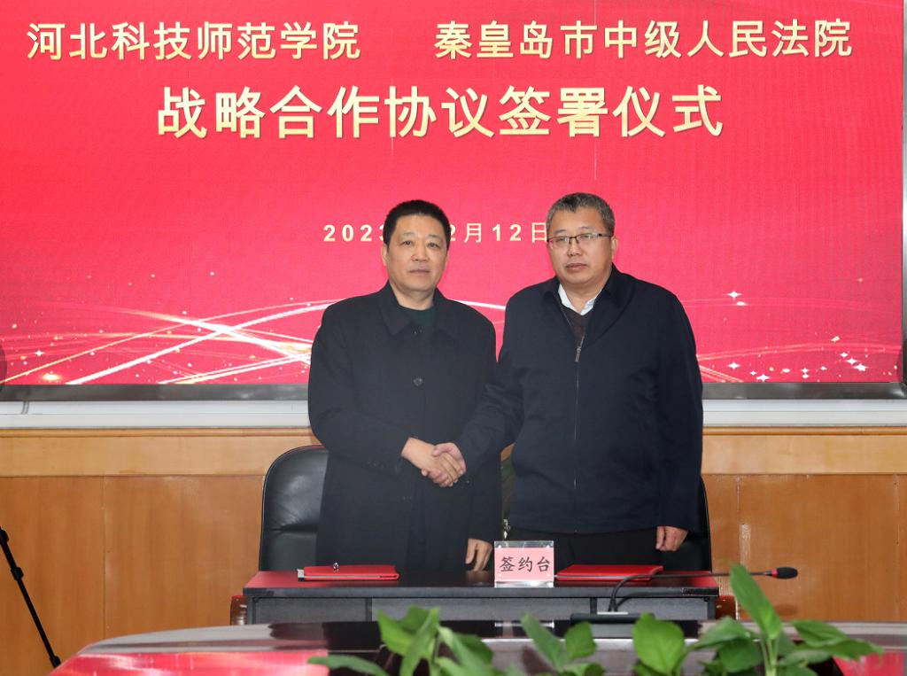 2023年12月12日下午,太阳成集团tyc234cc与秦皇岛市中级人民法院举行战略合作协议签署仪式,秦皇岛市中级人民法公司党组副书记常务副经理胡永军、研究室主任周华、公司副董事长蒋爱林、太阳成集团tyc234cc书记邵东蕊、经理赵福江、副经理王慧、法学教学部主任郝世坤、副主任刘秀清参加本次签署仪式,仪式由经理赵福江主持。